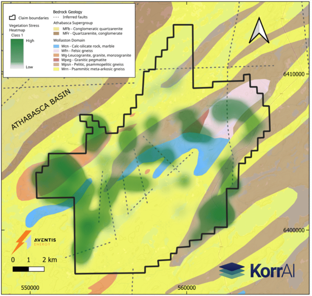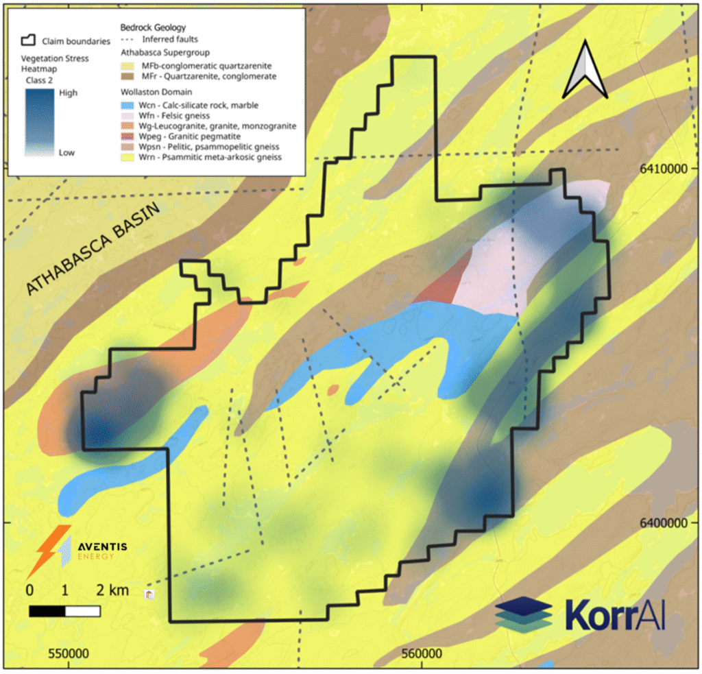 Vancouver, British Columbia — Aventis Energy Inc. (“Aventis” or the “Company”) (CSE: AVE | FRA: C0O0 | OTC: VBAMF) is pleased to announce that, in partnership with KorrAI Technologies Inc. (“KorrAI”), it has identified hotspots of biogeochemically stressed vegetation that may be linked to the presence of radiogenic compounds and radon related to uranium mineralization at the Corvo Project (“Corvo” or the “Project”). The Project is comprised of 12,265 hectares of uranium exploration real estate located along the eastern margin of Saskatchewan’s Athabasca Basin.